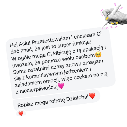 Dlatego pracuję nad moją aplikacją– narzędziem, które łączy jedzenie z emocjami. Zamiast kontrolować, wspiera. Zamiast oceniać, rozumie. Bo wiem jedno: mówienie Ci masz zjeść, to za mało!